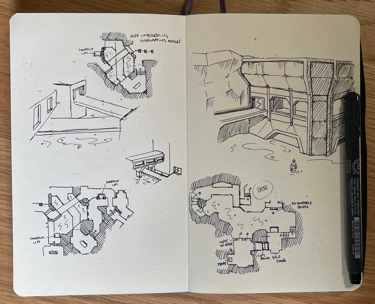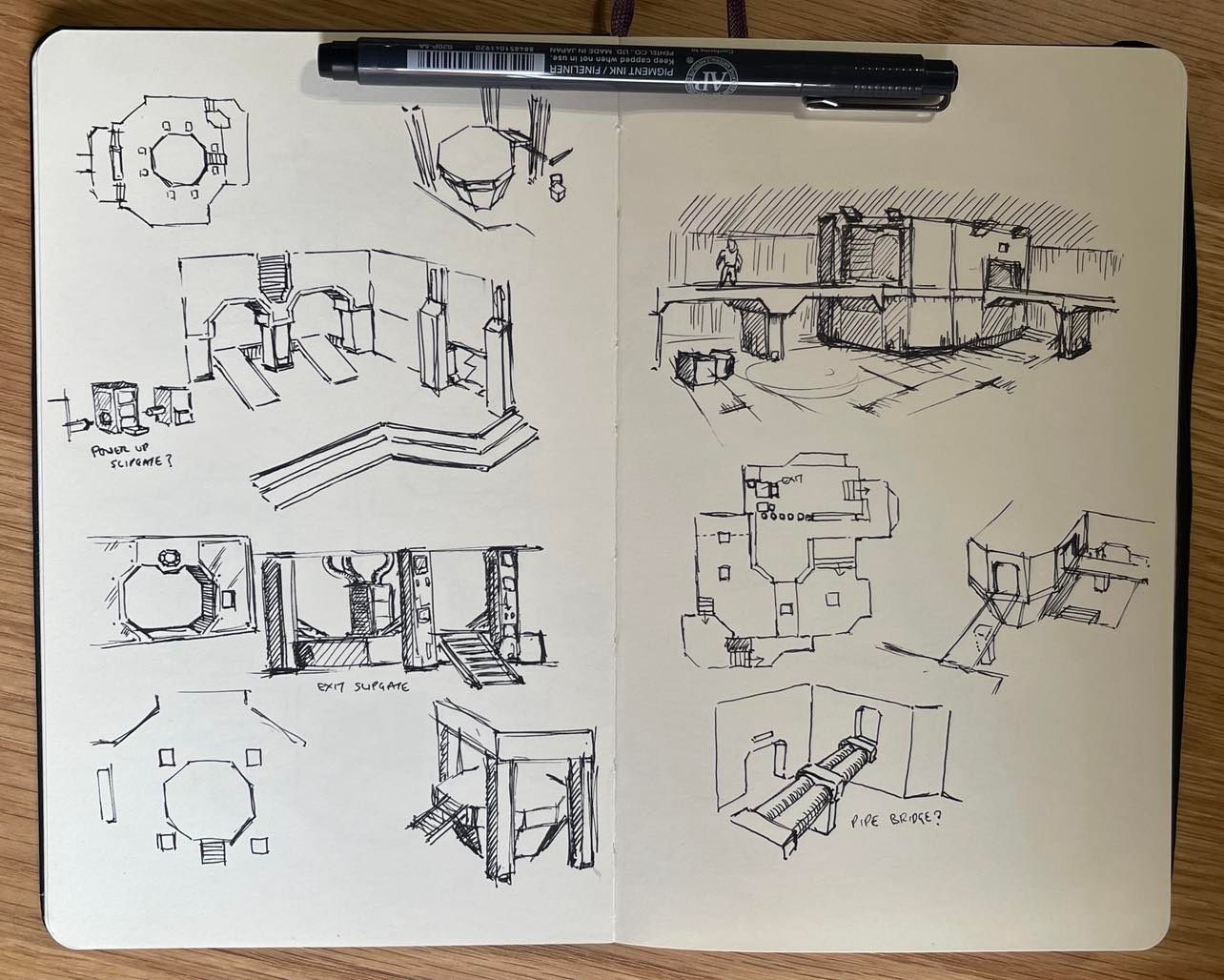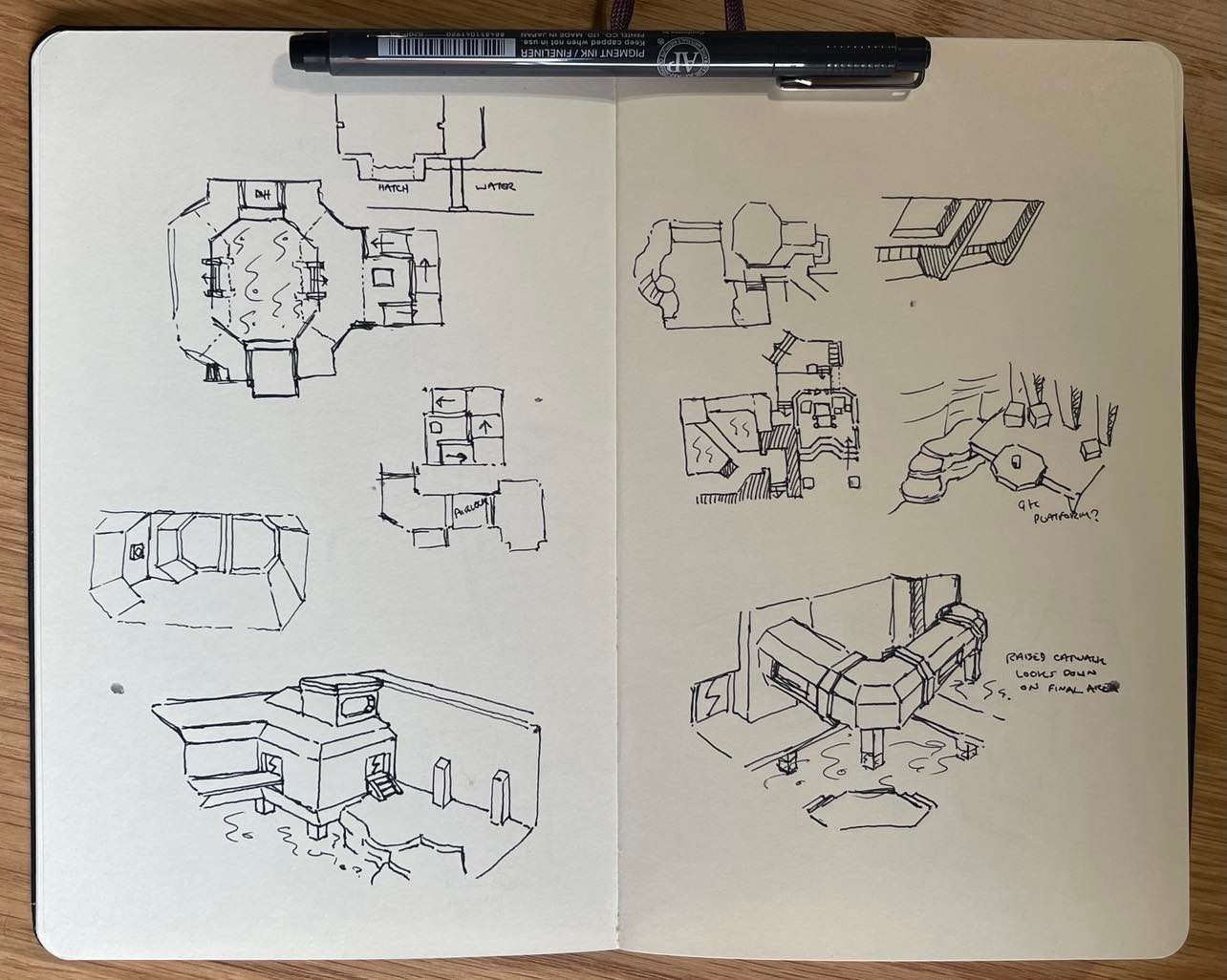 A lot of the sketches I did for this level were working out ways to connect the exterior and interior sections of base. I had initial ideas of the interior being sealed and pressurised, with a moon pool area that the player would swim down deep to access – and airlock sections between internal/external sections. I eventually scrapped the idea in favour of having barred windowed areas that overlooked the exterior – due to the limitation of no glass / alpha textures in ‘vanilla’ Quake.