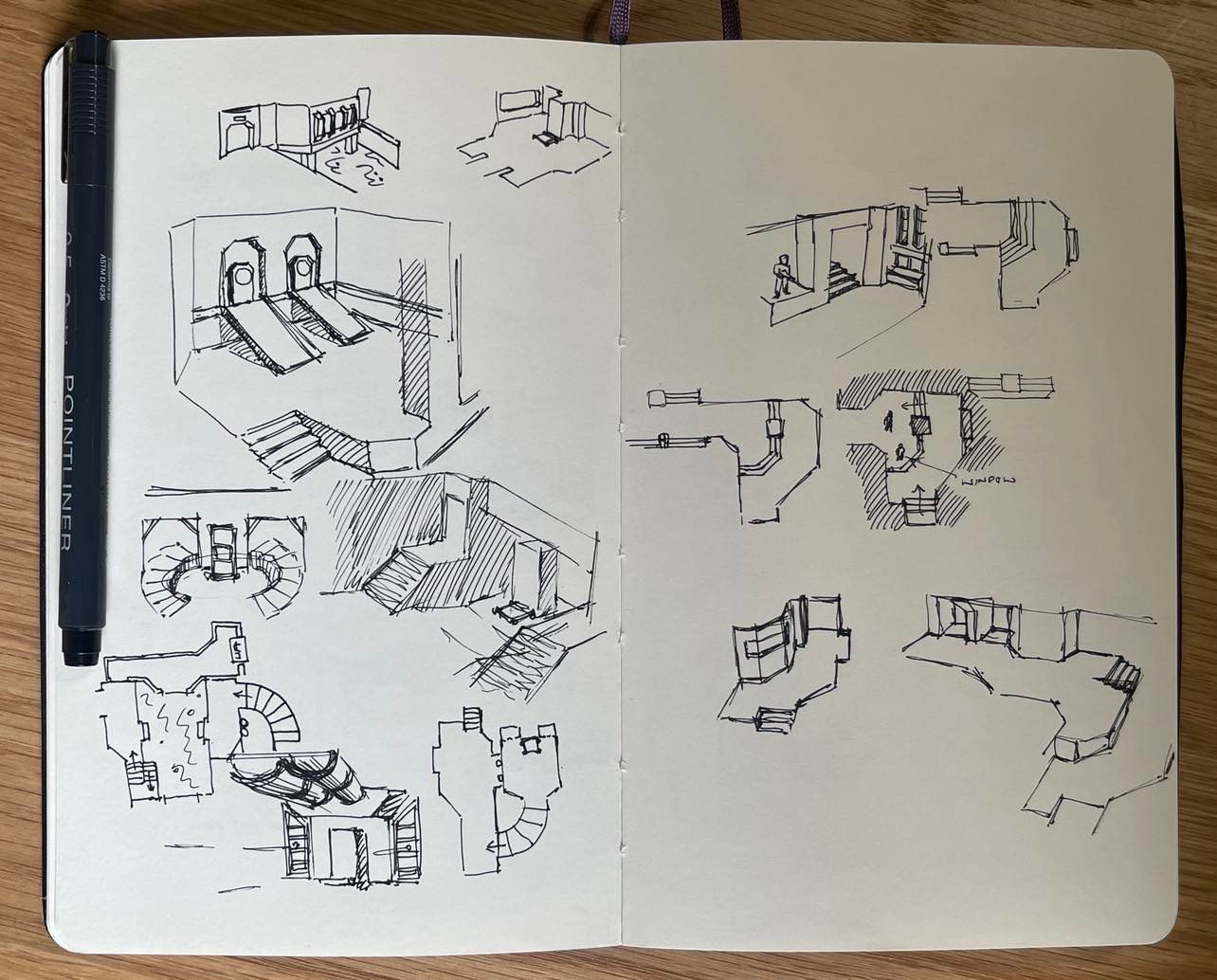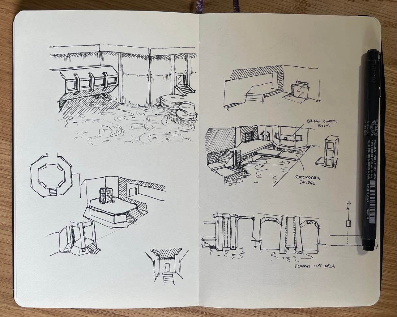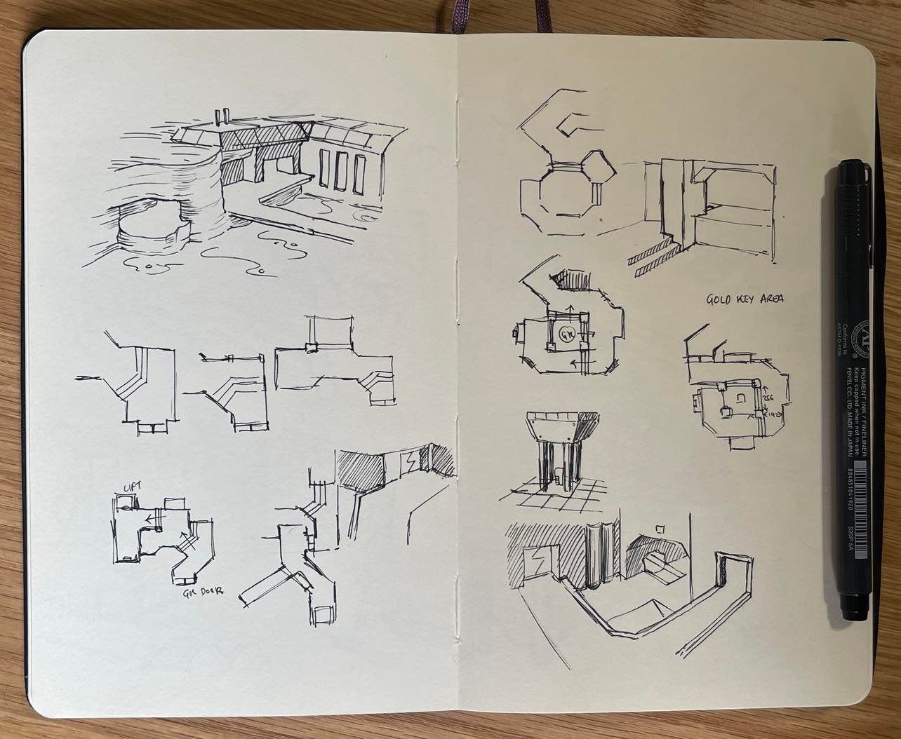 A lot of the sketches I did for this level were working out ways to connect the exterior and interior sections of base. I had initial ideas of the interior being sealed and pressurised, with a moon pool area that the player would swim down deep to access – and airlock sections between internal/external sections. I eventually scrapped the idea in favour of having barred windowed areas that overlooked the exterior – due to the limitation of no glass / alpha textures in ‘vanilla’ Quake.