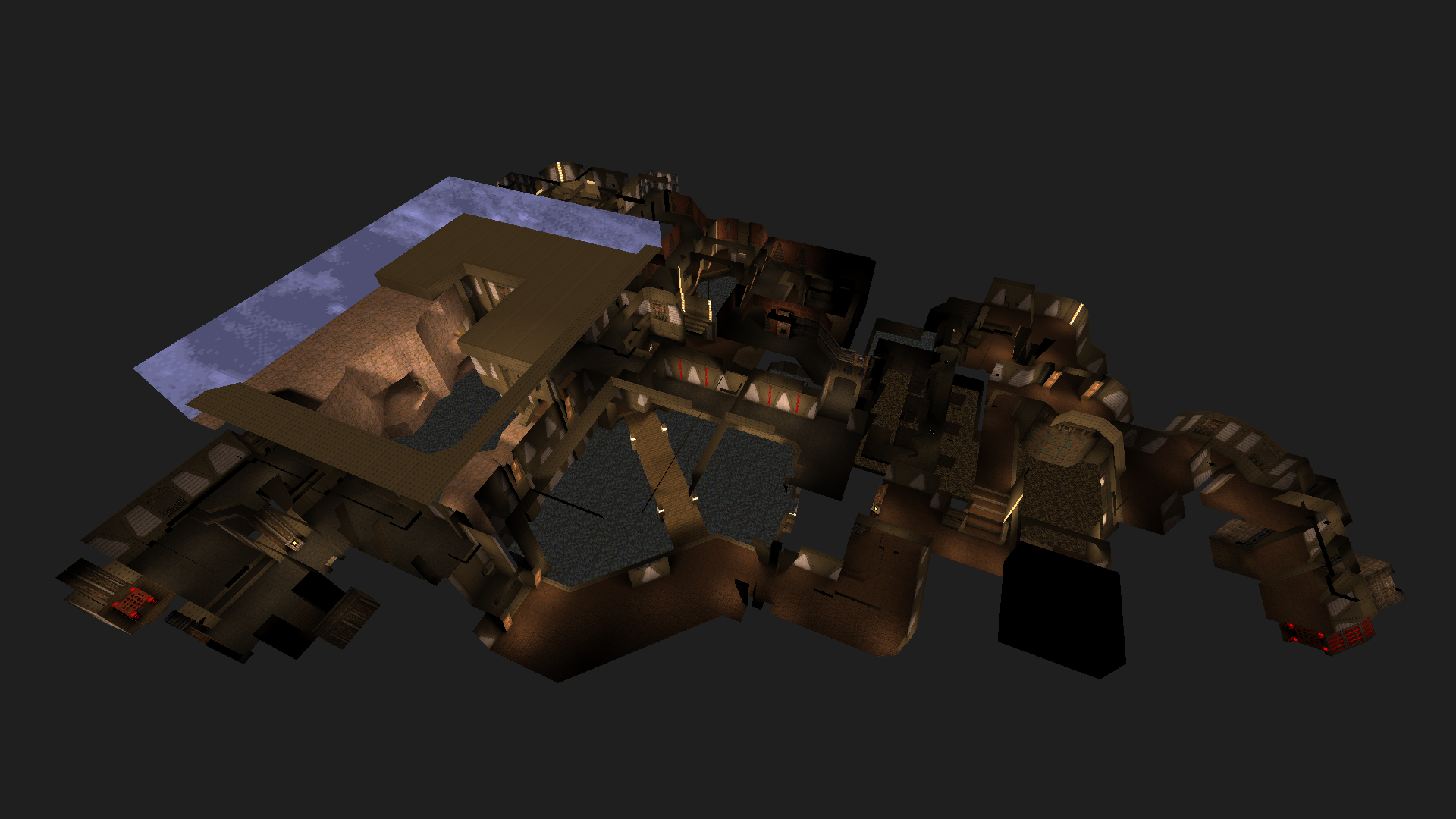 The third level I took on for Tremor was another base map, which has always been my favourite Quake theme. Again I took inspiration from the original E2M1 by starting with a central idea (the bridge across the water room) and building outwards.