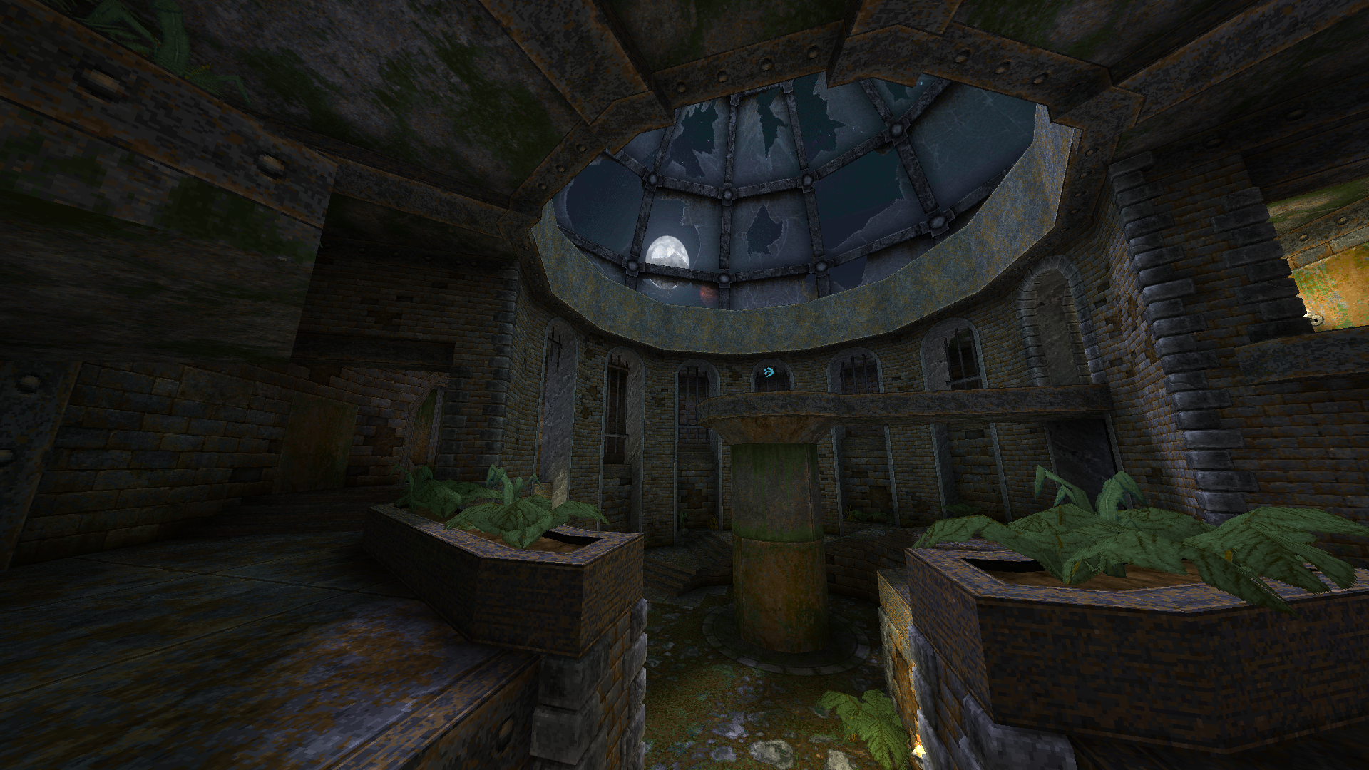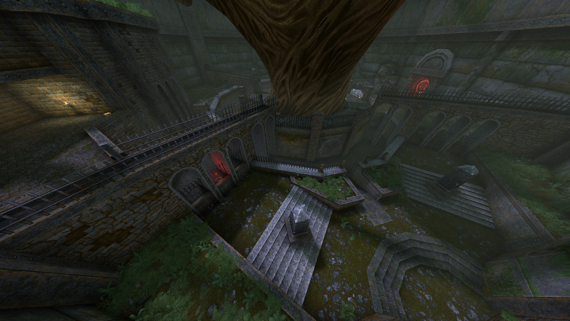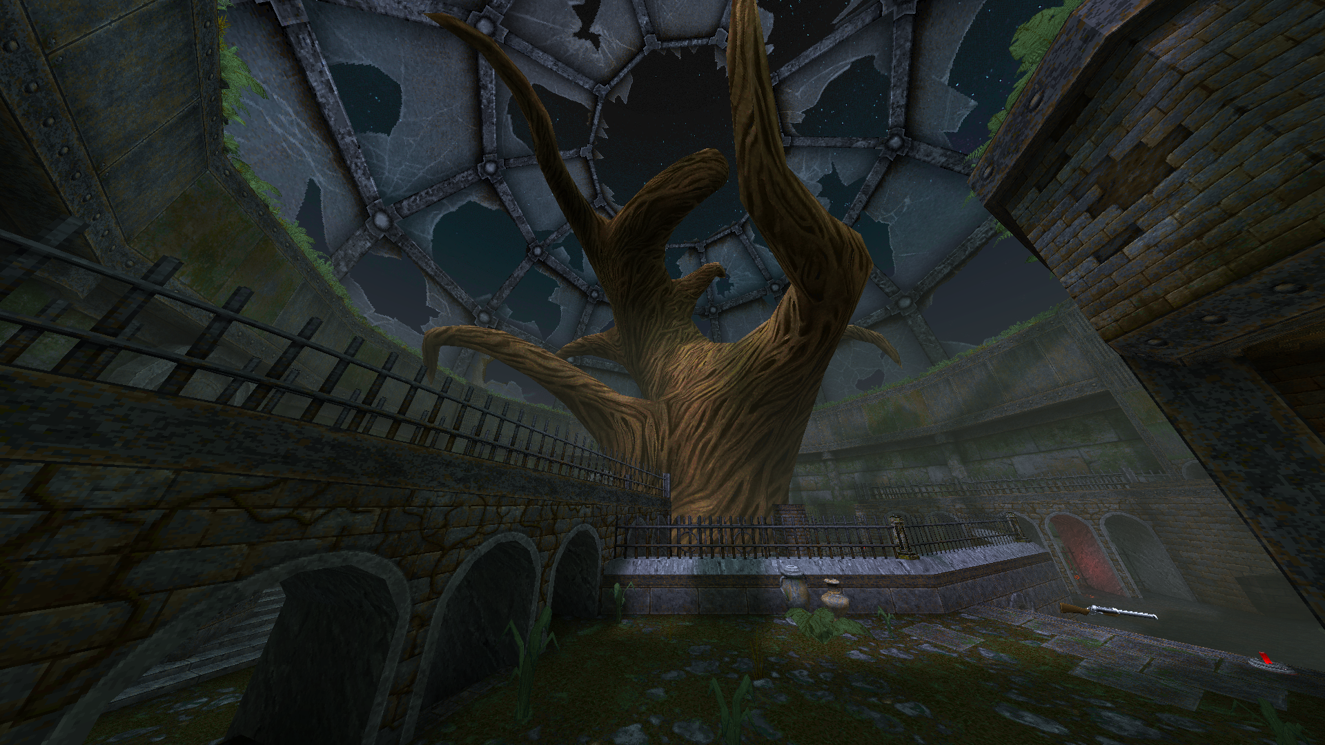At the heart of the level stands a giant dead tree covered by a large broken dome. As this was the central focus of the map I made this a hub area that led off into individual sections but always brought the player back to the hub to unlock the next key door, to help the flow and avoid them getting lost.