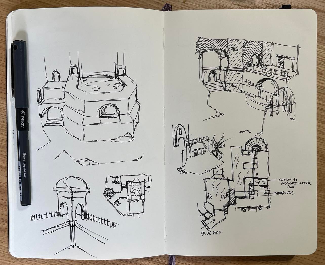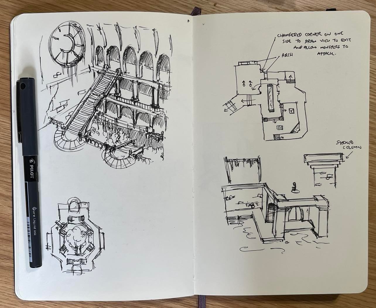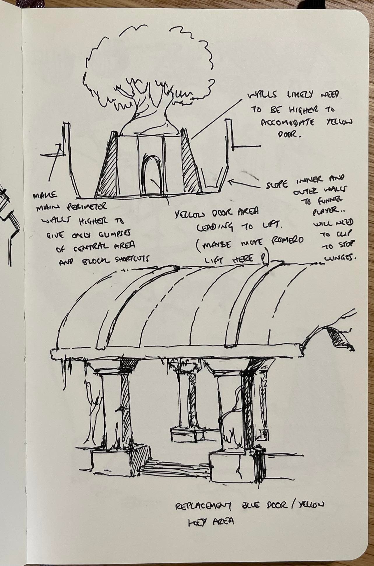 I did a lot of sketches to help establish the theme as well as roughing out ideas of how an area might flow. Initially the level had more temple influences, and I researched ancient Babylon and the hanging gardens. Thematically it moved towards a more overgrown industrial facility, with large brick built aqueducts feeding in to the central tree, and the greenhouse like dome towering above. I managed to retain some feel of ancient temples in the adjoining sections that house the second save shrine.