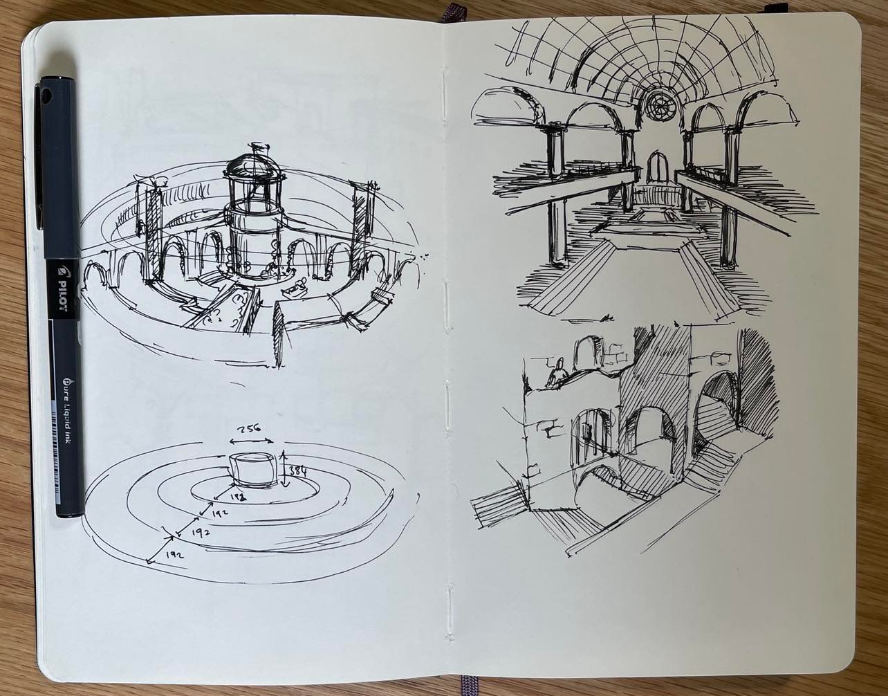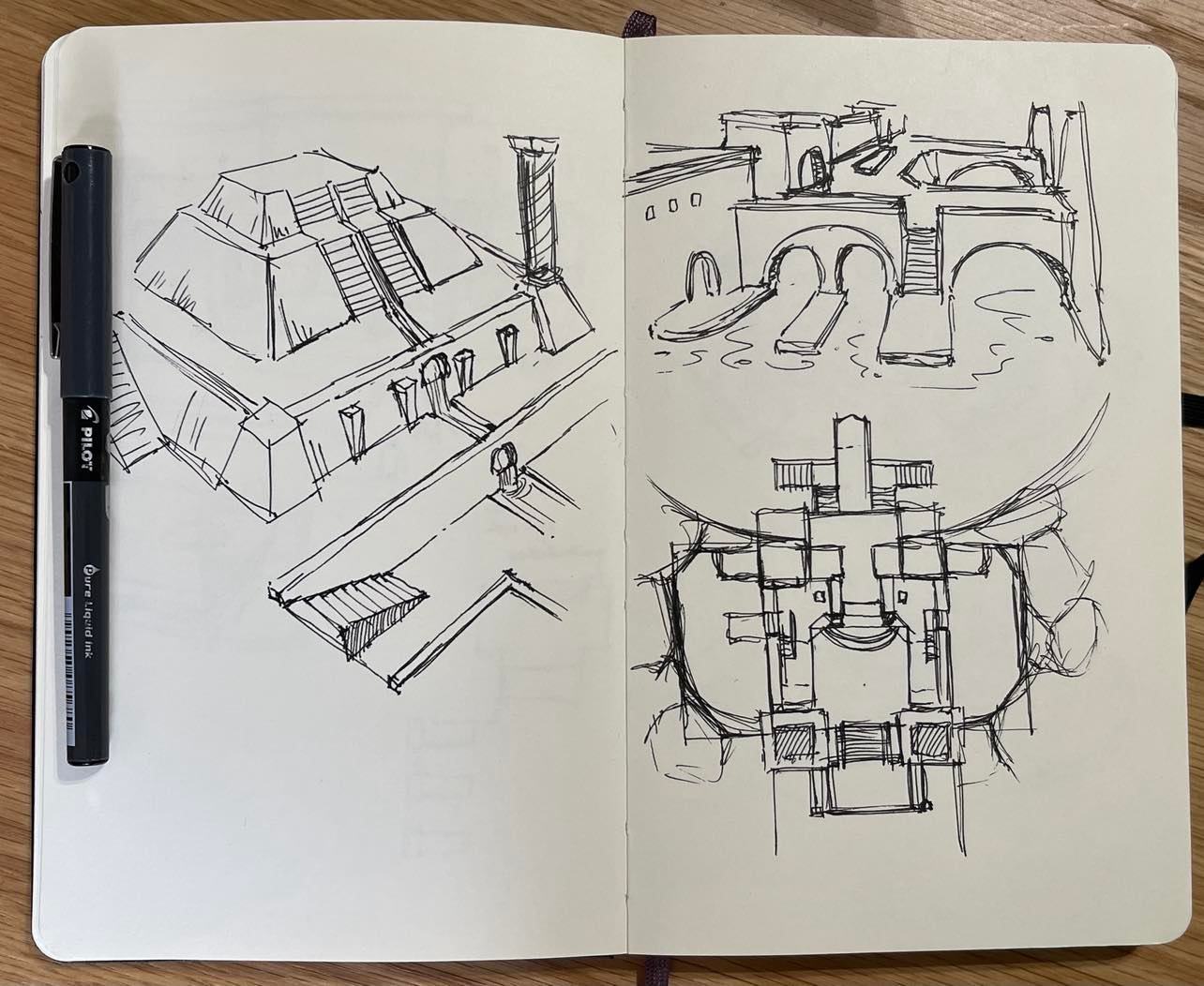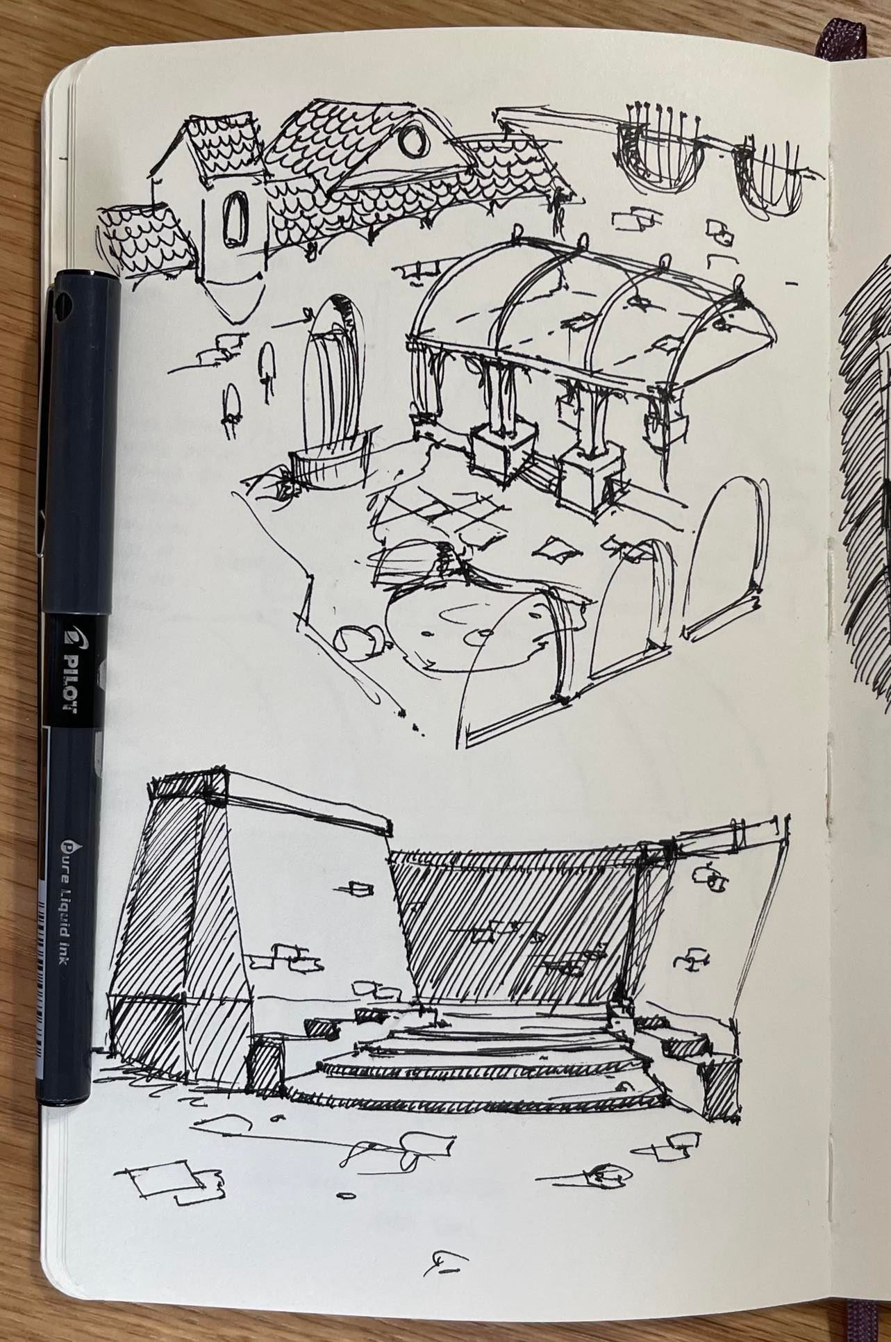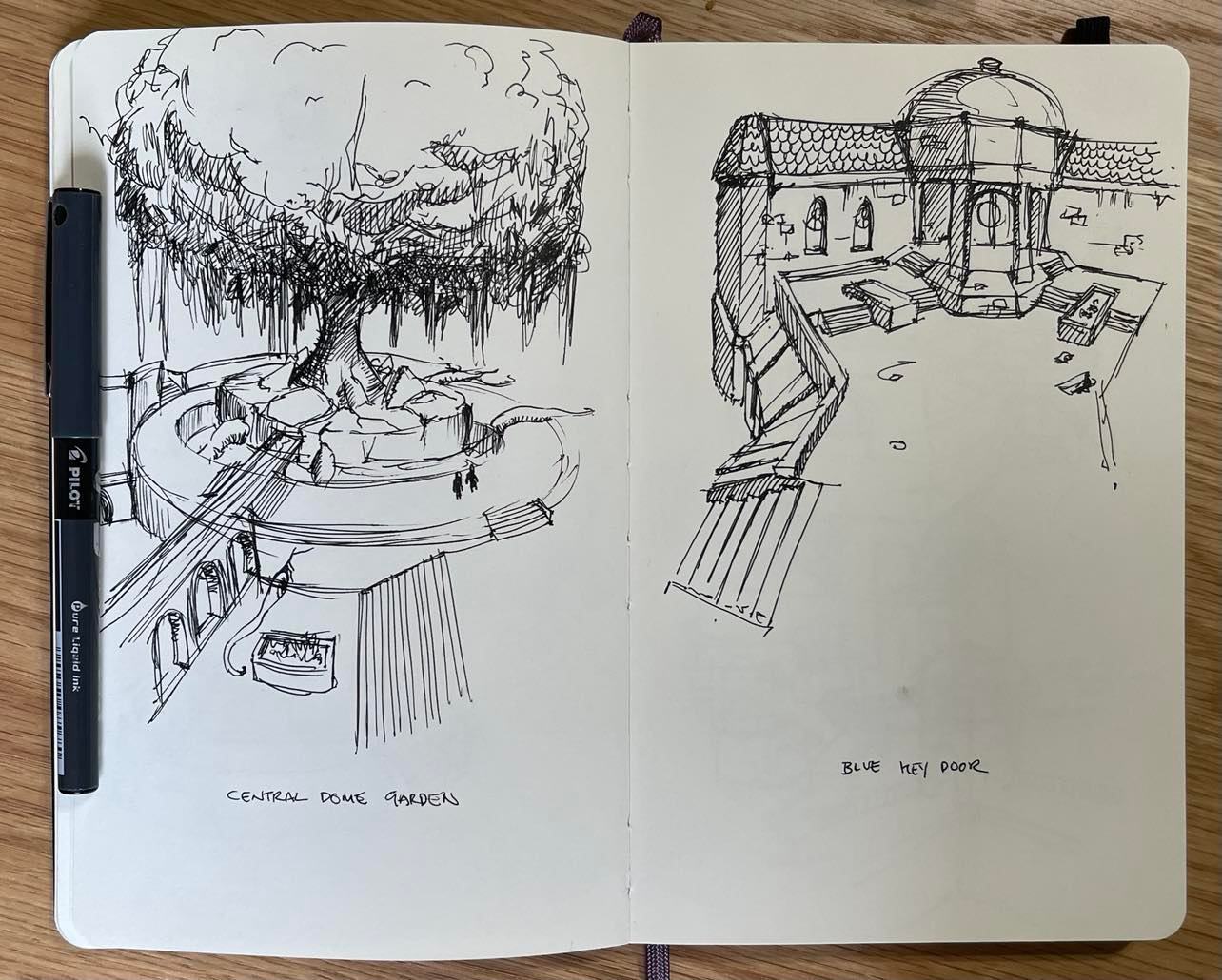 I did a lot of sketches to help establish the theme as well as roughing out ideas of how an area might flow. Initially the level had more temple influences, and I researched ancient Babylon and the hanging gardens. Thematically it moved towards a more overgrown industrial facility, with large brick built aqueducts feeding in to the central tree, and the greenhouse like dome towering above. I managed to retain some feel of ancient temples in the adjoining sections that house the second save shrine.